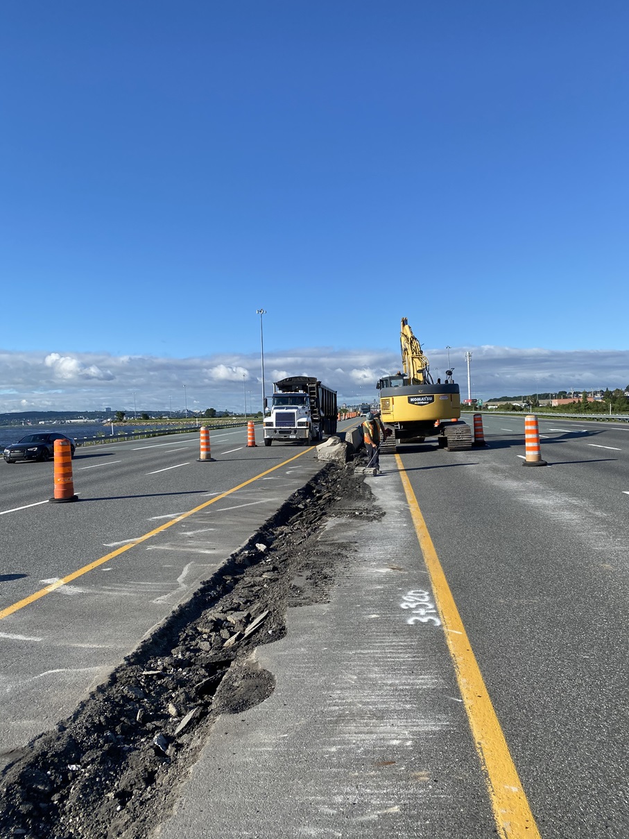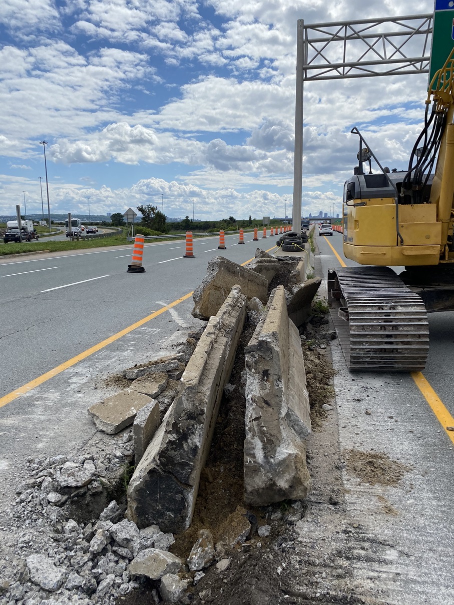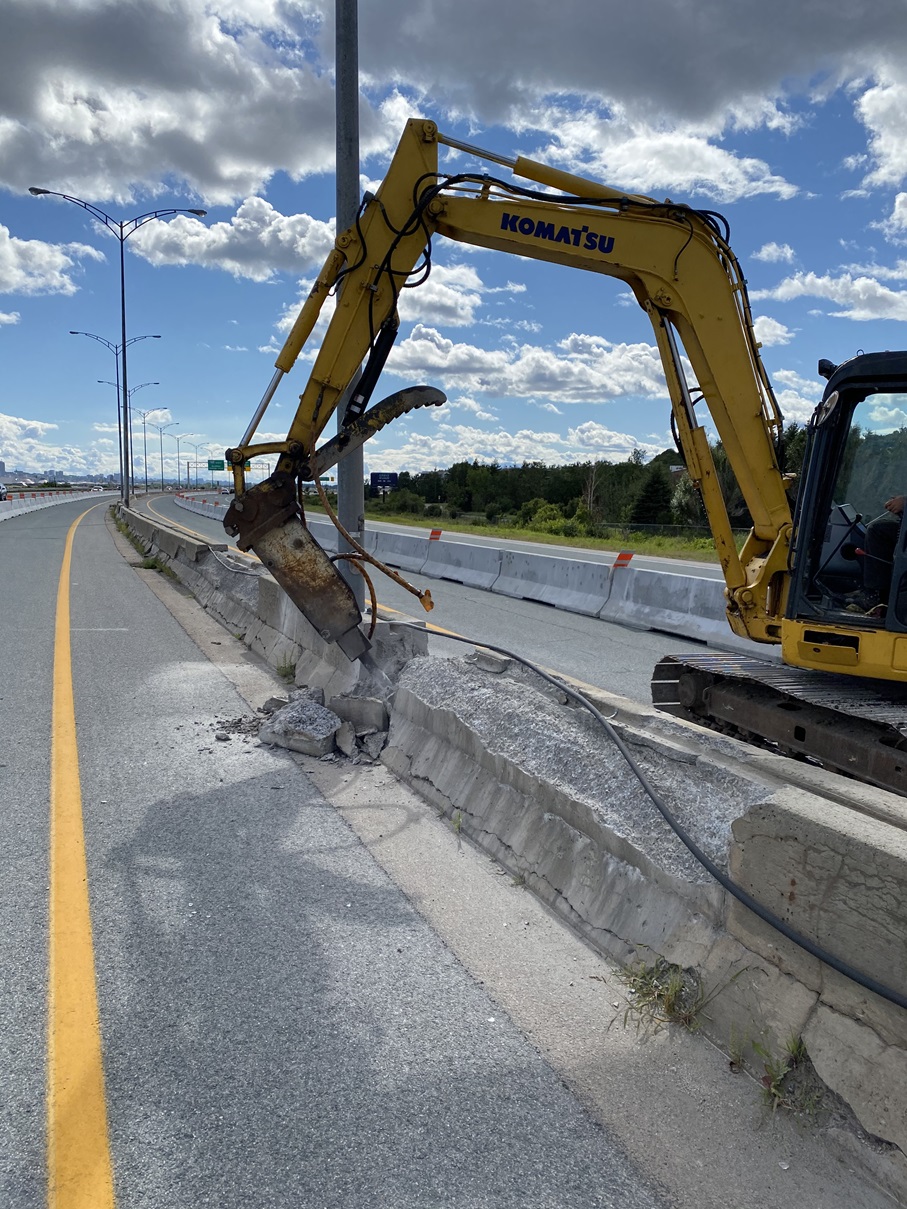 Mtq projet Duffrin Montmorency. Démolition de la glissière médiane en béton sur l'autoroute Dufferin-Montmorency (A-440)